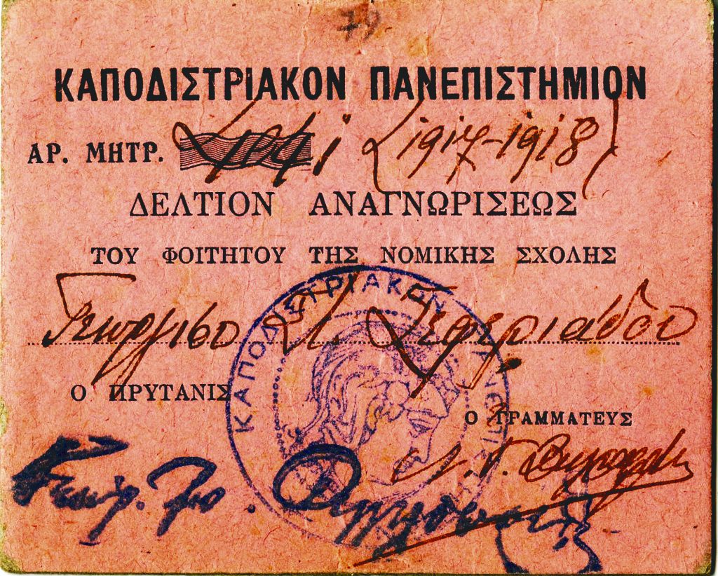 Το «δελτίον αναγνωρίσεως» (αντίστοιχο με το σημερινό πάσο) του Γιώργου Σεφέρη από το Καποδιστριακό Πανεπιστήμιο.