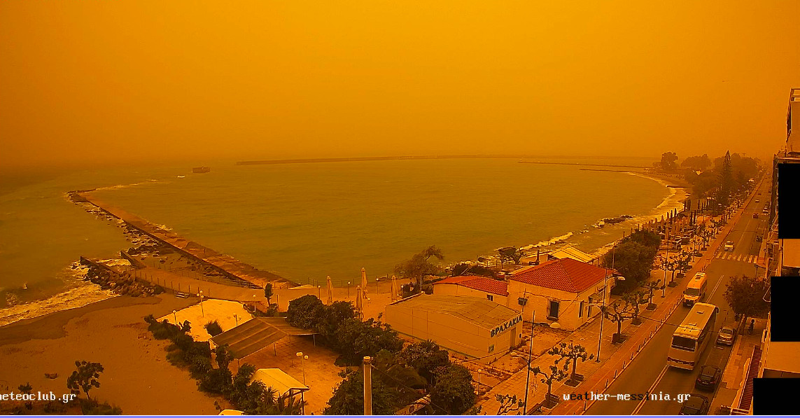 Πρωτόγνωρες εικόνες αντικρίζουν οι κάτοικοι της Καλαμάτας λόγω της αφρικανικής σκόνης που έχει καλύψει κυριολεκτικά τα πάντα. Ο ουρανός της μεσσηνιακής πρωτεύουσας βάφτηκε κίτρινος από την υψηλή συγκέντρωση αφρικανικής σκόνης. Οι θυελλώδεις νοτιάδες μετέφεραν μεγάλες ποσότητες σαχαριανής σκόνης, κάνοντας αποπνικτική την ατμόσφαιρα ειδικά για όσους αντιμετωπίζουν αναπνευστικά προβλήματα.