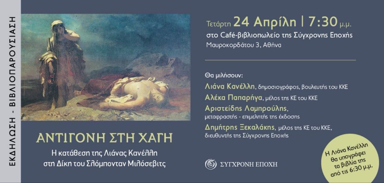 Ήταν η κατάθεση της βουλεύτριας του ΚΚΕ Λιάνας Καννέλη. Και αυτή την κατάθεση μετέφρασε ο Αριστείδης Λαμπρούλης, δημοτικός σύμβουλος Λάρισας, στο βιβλίο «Αντιγόνη στη Χάγη. Η κατάθεση της Λιάνας Κανέλλη στη Δίκη του Σλόμπονταν Μιλόσεβιτς».