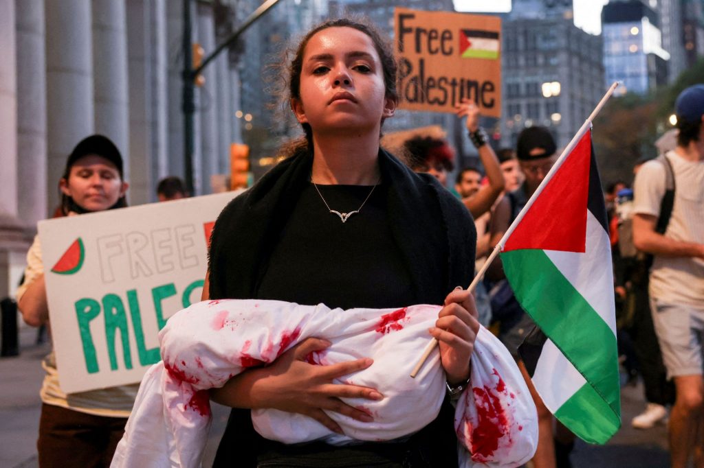 Συμβολική διαμαρτυρία σε πρόσφατη διαδήλωση στη Νέα Υόρκη κατά της αιματοχυσίας στη Λωρίδα της Γάζας (REUTERS/Caitlin Ochs)