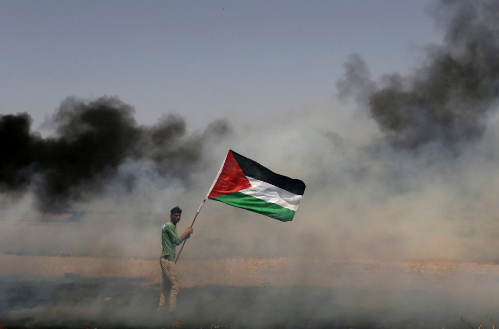 Διαδηλωτής υψώνει την παλαιστινιακή σημαία στα σύνορα στη νότια Λωρίδα της Γάζας, εν μέσω καπνών από συγκρούσεις σε παλαιότερες διαμαρτυρίες κατά του Ισραήλ (REUTERS/Ibraheem Abu Mustafa)