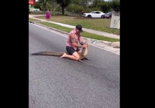 Οι υπάλληλοι αρπάζουν το ερπετό με δύο λουριά και τα τυλίγουν γύρω από την κοιλιά του αλιγάτορα, αλλά αυτός κουνιέται και αντιστέκεται. Μετά από λίγη μάχη, το ζώο τελικά απομακρύνθηκε επιτυχώς από την άσφαλτο.
