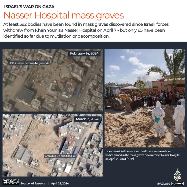 Στην ανακοίνωσή του, ο ισραηλινός στρατός αναφέρει ότι κατά τη διάρκεια της παραμονής των δυνάμεών του στη Χαν Γιούνις «εξετάστηκαν πτώματα που είχαν θαφτεί από Παλαιστίνιους στην περιοχή του νοσοκομείου Νάσερ, στο πλαίσιο των προσπαθειών για τον εντοπισμό απαχθέντων και αγνοουμένων».