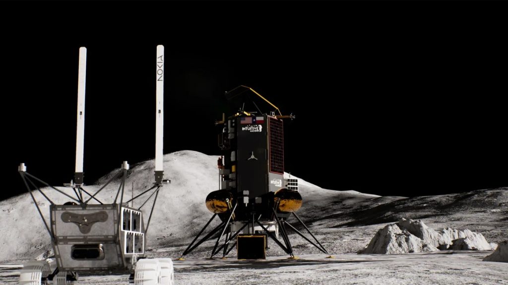 Καλλιτεχνική απεικόνιση ενός ρομποτικού οχήματος με κεραίες Nokia δίπλα στη σεληνάκατο της Intuitive Machines (Nokia Bell Labs)