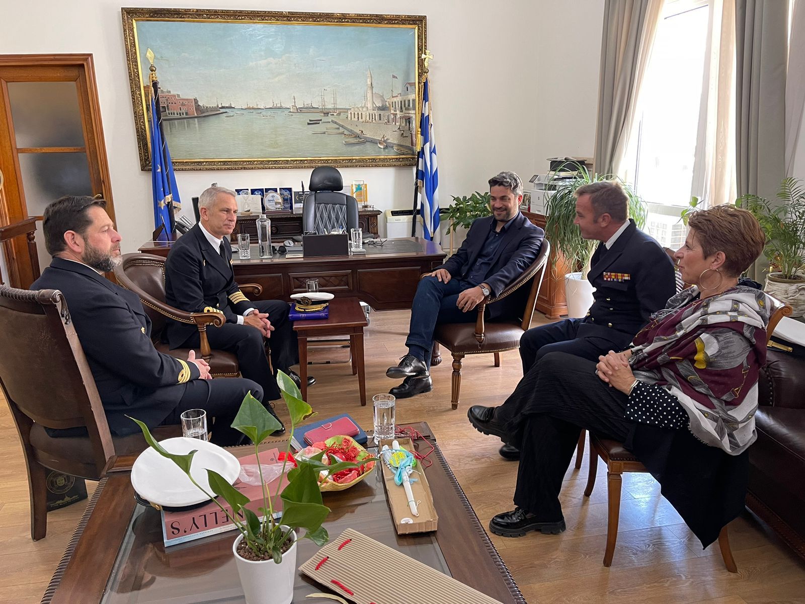 Ο κ. Σημανδηράκης υποδέχθηκε τον Πλοίαρχο, Α. Garcia Estevan, κυβερνήτη του αποβατικού πλοίου «LPD. GALICIA» και τους Αντιπλοιάρχους, S. Regil-Moreno, Κυβερνήτη της Φρεγάτας «BLAS DE LEZO» και J. Franco González-Cela, Κυβερνήτη της Φρεγάτας «REINA SOFIA», στο Γραφείο του, μαζί με την Αντιδήμαρχο, Ελένη Ζερβουδάκη.