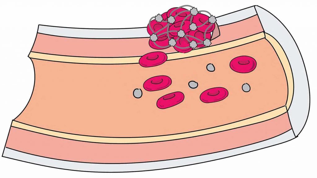 Αιμοπετάλια (άσπροι κύκλοι) ενώνονται με ερυθρά αιμοσφαίρια και σχηματίζουν θρόμβο στο σημείο τραυματισμού ενός αγγείου ( ASCCC OERI)