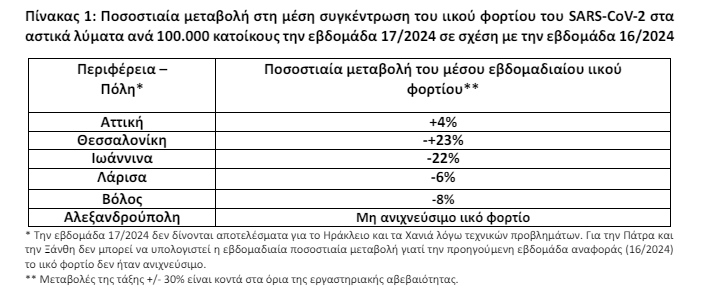 Επίσης την εβδομάδα, 22 – 28 Απριλίου 2024, παρατηρήθηκε αυξητική τάση σε σχέση με την προηγούμενη εβδομάδα στο μέσο εβδομαδιαίο ιικό φορτίο του SARS-CoV-2 στα αστικά λύματα σε τρεις από τις οκτώ περιοχές που ελέγχθηκαν από το Εθνικό Δίκτυο Επιδημιολογίας Λυμάτων (ΕΔΕΛ) του ΕΟΔΥ.