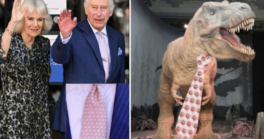 Το Μουσείο λοιπόν, με αφορμή αυτή την ενδυματολογική επιλογή του βασιλιά Καρόλου, προχώρησε σε μια αστεία ανάρτηση με το άγαλμα του δεινοσαύρου να «φορά» μία ροζ γραβάτα με το πρόσωπο του μονάρχη.