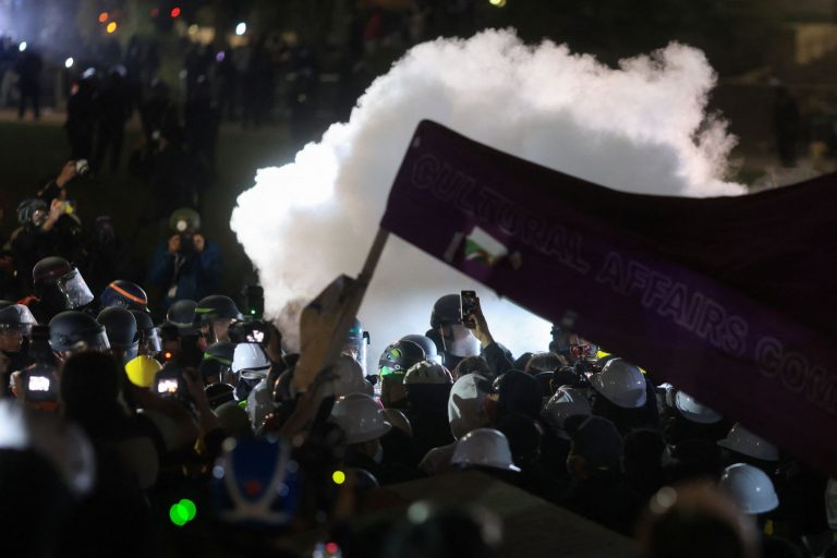 Η αστυνομία κάνει χρήση κρότου λάμψης και δακρυγόνων εναντίον των φιλοπαλαιστίνιων διαδηλωτών που είχαν προχωρήσει σε κατάληψη στους χώρους του πανεπιστημίου UCLA και είχαν προκαλέσει μεγάλες καταστροφές.