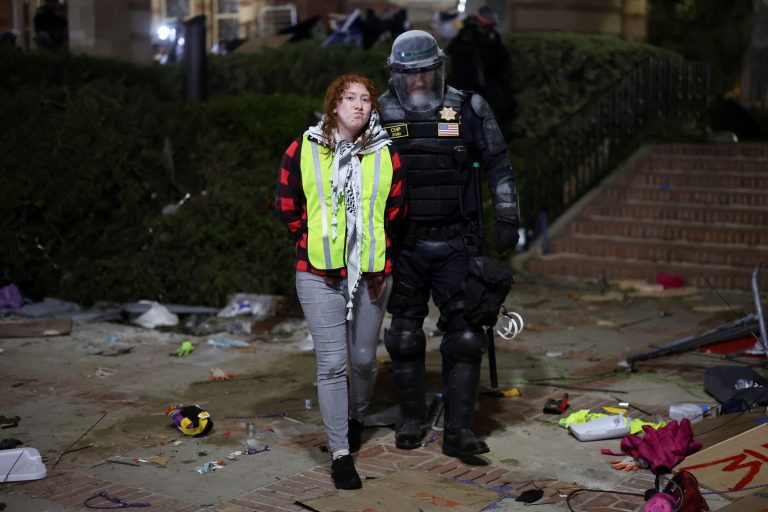 Σύμφωνα με την τελευταία ενημέρωση από το Reuters, ζωντανά τηλεοπτικά πλάνα έδειξαν περίπου έξι διαδηλωτές στο UCLA υπό κράτηση, γονατισμένους στο έδαφος, με τα χέρια δεμένα πίσω από την πλάτη τους.