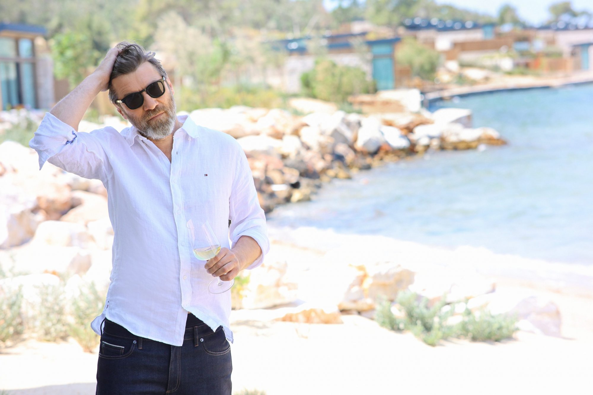 Ναι, μου αρέσει το κρασί. Μάλιστα μου αρέσουν πολύ τα κρασιά του Κυρ-Γιάννη –ακόμα και τα φτηνά του– και κάποια του Μπουτάρη. Πρέπει να πω ωστόσο ότι είμαι και λάτρης της τσικουδιάς και απολαμβάνω ένα καλό ουίσκι το βράδυ. Στη winery όπου βρισκόμαστε, το Line Athens, κάνουν το δικό τους κρασί. Ασχολούνται γενικά με τη ζύμωση βασιζόμενοι σε τρεις προϊοντικούς πυλώνες, που είναι το ψωμί, η μπίρα και το κρασί. Φτιάχνουν κρασί από άλλες ύλες αγροτικής προέλευσης, δηλαδή από άλλα φρούτα πέρα από το σταφύλι, όπως μήλο, φράουλα, σύκο και ρόδι. Τους αφορά η βιωσιμότητα, η οποία βέβαια ξεκινά από το πώς σκέφτεται κάποιος, πώς το χτίζει μέσα του και μετά το εξωτερικεύει. Δεν λένε wine αλλά why-in, δύο λέξεις που ακούγονται το ίδιο όταν τις προφέρεις. Ο λόγος για τον οποίο αφοσιώθηκαν τόσο είναι επειδή το σταφύλι, τα τελευταία χρόνια, με την κλιματική αλλαγή, δυσκολεύεται πάρα πολύ – είτε για να καρποφορήσει το φυτό είτε γιατί, για να φτάσει ως ποικιλία εκεί όπου θα έπρεπε, έχει χάσει από το γευστικό DNA του. Άλλος ένας λόγος είναι και η αυξανόμενη ζήτηση του κρασιού. Οπότε, σκέφτηκαν να βοηθήσουν το σταφύλι στρεφόμενοι σε ένα άλλο προϊόν, που όμως θα προσφέρει μια παρόμοια εμπειρία σε όσους απολαμβάνουν να πίνουν κρασί. Προσπαθούν μάλιστα να μοιραστούν αυτήν τη γνώση τους ώστε να λάβει ευρύτερη διάσταση και να υπάρξει μεγαλύτερη απήχηση.