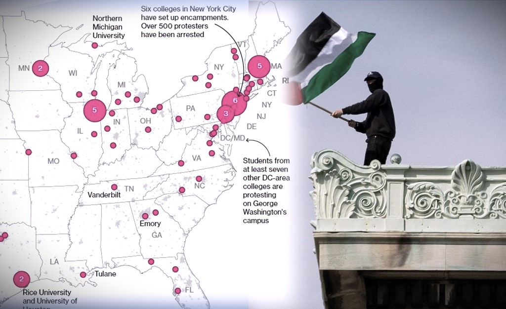 Σύμφωνα με το Bloomberg, οι καταυλισμοί που έχoυν στηθεί υπέρ της Παλαιστίνης έχουν εξαπλωθεί σε τουλάχιστον 100 κολέγια σε 30 πολιτείες και την Ουάσιγκτον, ενώ σχεδόν 1.600 άτομα έχουν συλληφθεί στις πανεπιστημιουπόλεις από τότε που οι διαδηλωτές έστησαν για πρώτη φορά σκηνές στο Πανεπιστήμιο του Κολούμπια στις 17 Απριλίου.