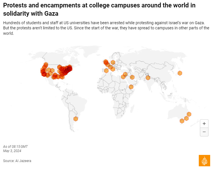 Λένε ότι οι διαμαρτυρίες, μέχρι τώρα, ήταν απολύτως ειρηνικές και ότι η βία που έχει έρθει σε πολλές από αυτές τις πανεπιστημιουπόλεις προέρχεται από την αστυνομία – όταν εισέβαλε στο Πανεπιστήμιο Κολούμπια, όταν εισέβαλε στο UCLA στο Λος Άντζελες, μεταξύ άλλων πανεπιστημίων.