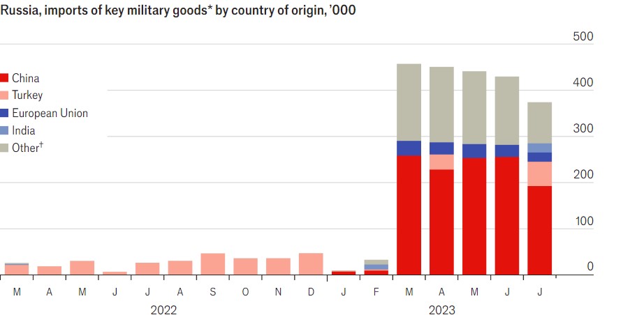 Οι εταιρείες στην Κίνα έχουν παράσχει στη Ρωσία προϊόντα που είναι ζωτικής σημασίας για την κατασκευή διαφόρων οπλικών συστημάτων. Παρείχαν επίσης εξοπλισμό πλοήγησης, εξαρτήματα για τζετ και πιο γενικά προϊόντα, όπως ρουλεμάν, που χρησιμοποιούνται σε πυροβολικά και άλλο εξοπλισμό.