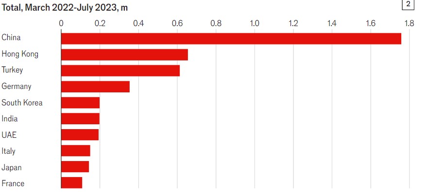 Tα προϊόντα συχνά διακινούνται μέσω ενός πολύπλοκου δικτύου εταιρειών. Όμως, μια μελέτη των εμπορικών δεδομένων από το Κέντρο Στρατηγικών και Διεθνών Μελετών, μια ομάδα σκέψης στην Ουάσιγκτον, υποδηλώνει ότι πολλές από τις εισαγωγές οδηγούν πίσω σε μία χώρα.