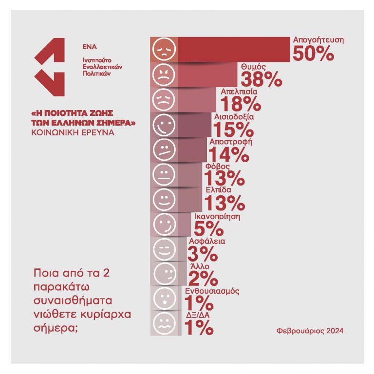 Με βάση τα ευρήματα της κοινωνικής έρευνας του ΕΝΑ (Φεβρουάριος 2024) συναντά κανείς ένα ακόμα πιο διευρυμένο κοινωνικά συναίσθημα της απογοήτευσης. Αν δει κανείς και τα ποιοτικά χαρακτηριστικά αυτά δείχνουν με μεγαλύτερη ένταση απογοητευμένους πολίτες μεταξύ των χαμηλότερων εισοδημάτων, μεταξύ των γυναικών αλλά και μεταξύ όσων θεωρούν ότι έννοιες όπως «Αριστερά» και «Δεξιά» έχουν χάσει πλέον το νόημά τους.