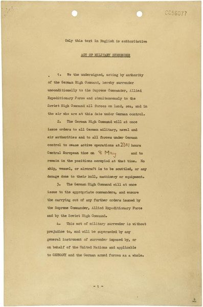 Τα ξημερώματα της Δευτέρας 7ης Μαΐου 1945 υπεγράφη στην έδρα της Ανωτάτης Διοικήσεως της Συμμαχικής Εκστρατευτικής Δύναμης (Supreme Headquarters Allied Expeditionary Force, SHAEF), στην πόλη Ρεμς (Reims) της βορειοανατολικής Γαλλίας, το κείμενο της συμφωνίας για την άνευ όρων παράδοση του Τρίτου Ράιχ, τη συνθηκολόγηση δηλαδή των Γερμανών, που σηματοδότησε τον ουσιαστικό τερματισμό του Β’ Παγκοσμίου Πολέμου.