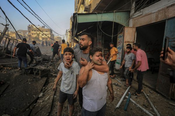 Ένας άνδρας κρατάει τα δύο ανίψια του καθώς οι Παλαιστίνιοι αναζητούν θύματα ισραηλινού πλήγματος σε κτίριο κατοικιών στην πόλη της Γάζας, 25 Οκτωβρίου 2023. REUTERS/Yasser Qudih