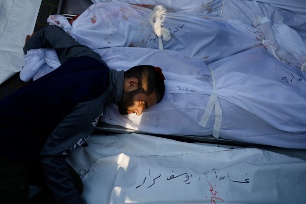 Ξημερώνει καθώς ένας επιζών από ισραηλινή αεροπορική επιδρομή στη νότια Γάζα, ο οποίος εκτοπίστηκε από την Πόλη της Γάζας και αναζήτησε καταφύγιο με την οικογένειά του στην πόλη Χαν Γιουνίς, ακουμπά το κεφάλι του στο πτώμα μιας συγγενούς του, της Ταμάμ, που βρίσκεται δίπλα σε μέλη της οικογένειας που σκοτώθηκαν στην επιδρομή, στο νοσοκομείο Νάσερ, Χαν Γιουνίς, Γάζα, 24 Οκτωβρίου 2023. Η γραφή στο κάτω μέρος της εικόνας γράφει «Ghasan Ahmed Youssef Murad». REUTERS/Mohammed Salem