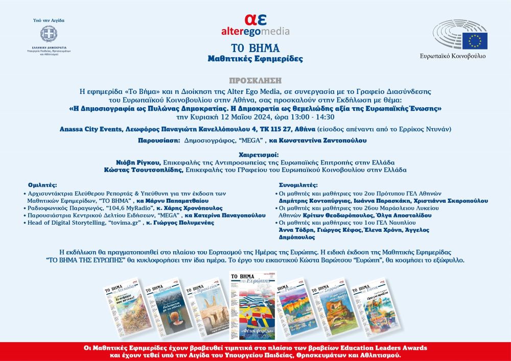 Εκδήλωση με θέμα: «Η Δημοσιογραφία ως Πυλώνας Δημοκρατίας. Η Δημοκρατία ως θεμελιώδης αξία της Ευρωπαϊκής Ένωσης», διοργανώνει η εφημερίδα «Το Βήμα» και η Διοίκηση της Alter Ego Media, σε συνεργασία με το Γραφείο Διασύνδεσης του Ευρωπαϊκού Κοινοβουλίου στην Αθήνα.