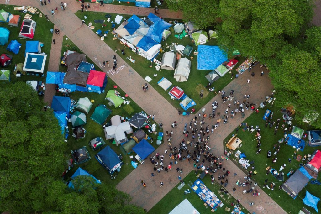 Φοιτητές από τον καταυλισμό αλληλεγγύης στην Παλαιστίνη στο Πανεπιστήμιο του Μάντσεστερ διαμαρτυρήθηκαν σχετικά με τις επενδύσεις του πανεπιστημίου στην εταιρεία όπλων BAE Systems και τους δεσμούς του με ισραηλινά ιδρύματα.