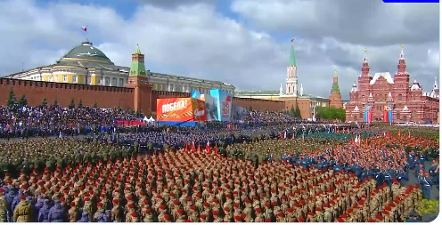 Στην Κόκκινη Πλατεία παρήλασαν μονάδες του ρωσικού στρατού και άρματα μάχης ενώ στον αέρα πετούσαν μαχητικά αεροπλάνα με τους βετεράνους του Β΄ Παγκοσμίου Πολέμου να παρακολουθούν.