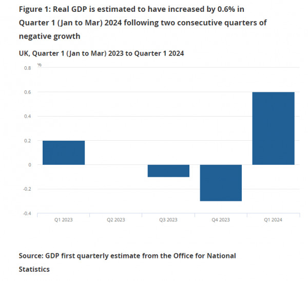 Με ρυθμό 0,6% αναπτύχθηκε η βρετανική οικονομία κατά το πρώτο τρίμηνο του τρέχοντος έτους, σύμφωνα με την Εθνική Στατιστική Υπηρεσία (ONS).