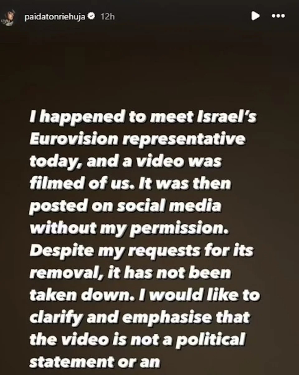 «Στη συνέχεια αναρτήθηκε στα μέσα κοινωνικής δικτύωσης χωρίς την άδειά μου. Παρά τα αιτήματά μου για την αφαίρεσή του, δεν έχει αφαιρεθεί. Θα ήθελα να διευκρινίσω και να τονίσω ότι το βίντεο δεν αποτελεί πολιτική δήλωση ή στήριξη οποιουδήποτε είδους».
