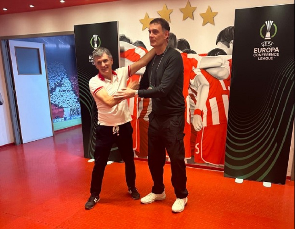 Στους χώρους του «Γ. Καραϊσκάκης» έλαβε χώρα μία συνάντηση… γιγάντων, με τους δύο προπονητές να αγκαλιάζονται και να ανταλλάζουν κάποιες γρήγορες κουβέντες.