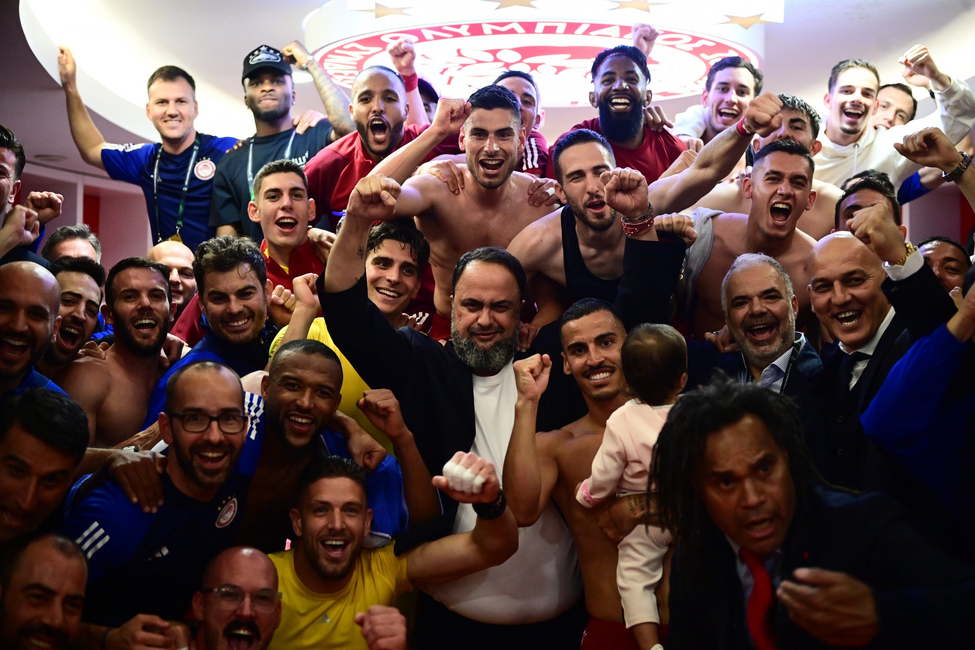 Οι παίκτες του Ολυμπιακού πανηγυρίζουν μαζί με τον πρόεδρο του συλλόγου, Βαγγέλη Μαρινάκη, την ιστορική πρόκριση στον τελικό του Conference League.