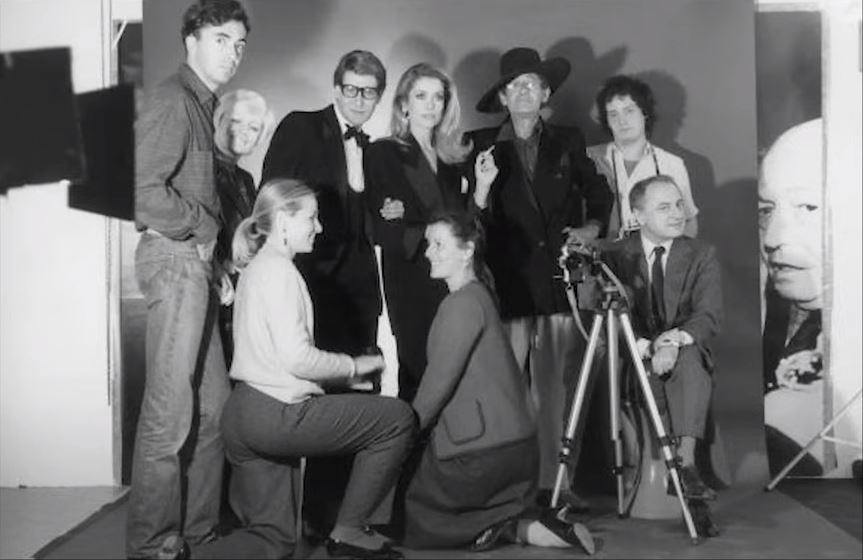 Ο Ιβ Σεν Λοράν (τρίτος από αριστερά, πάνω) με τον φωτογράφο Χέλμουτ Νιούτον (δεύτερο από δεξιά, πάνω), την Κατρίν Ντενέβ (δίπλα στον Ιβ, πάνω) και τον Πιερ Μπερζέ (κάτω, δεξιά) εν μέσω συνεργατών / Photo: YouTube