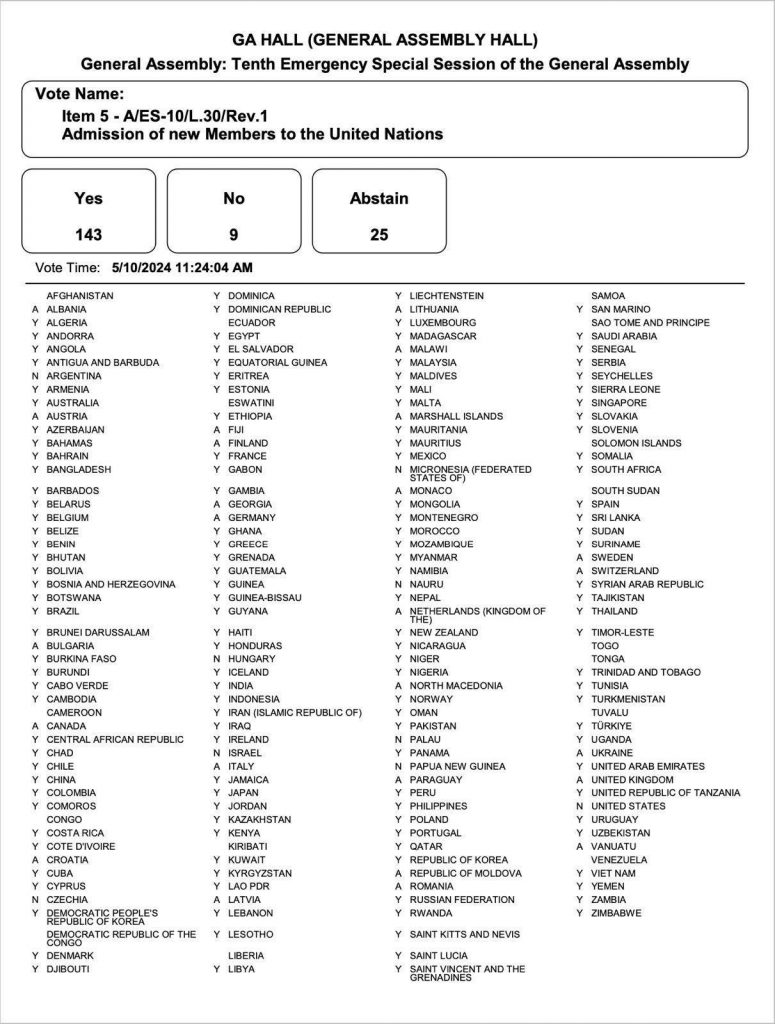 143 χώρες ψήφισαν υπέρ της παλαιστινιακής υποψηφιότητας, 9 κατά και 25 απείχαν.