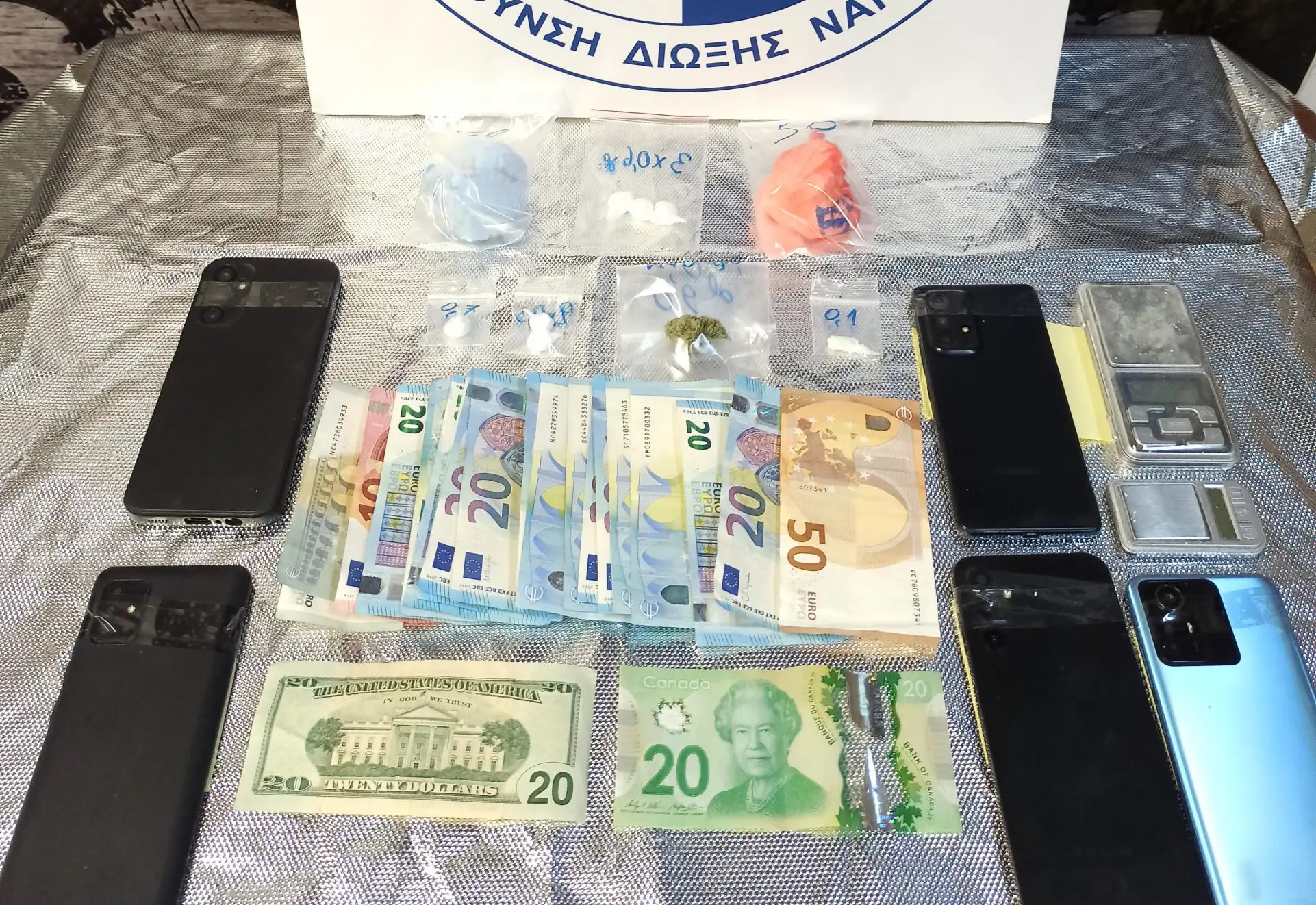 Συνολικά, βρέθηκαν και κατασχέθηκαν 103,5 γραμμάρια κοκαΐνης, μικροποσότητα ακατέργαστης κάνναβης, 440 ευρώ, 20 δολάρια ΗΠΑ και 20 δολάρια Καναδά, δύο ζυγαριές, πέντε κινητά τηλέφωνα και μία μοτοσυκλέτα.