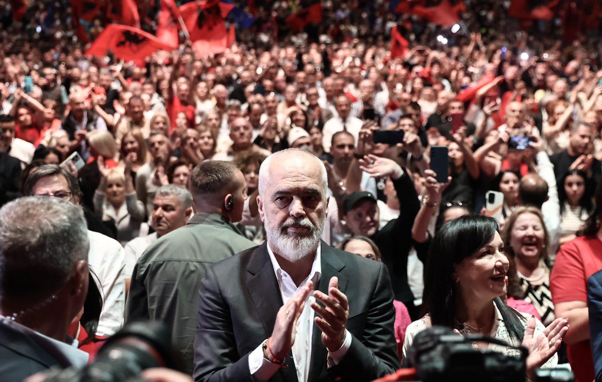 Ο Έντι Ράμα μπήκε στην αίθουσα λίγο μετά τις 12:00 υπό τους ήχους του αλβανικού εθνικού ύμνου και καταχειροκροτούμενος από τον κόσμο που φώναζε «Έντι, Έντι».