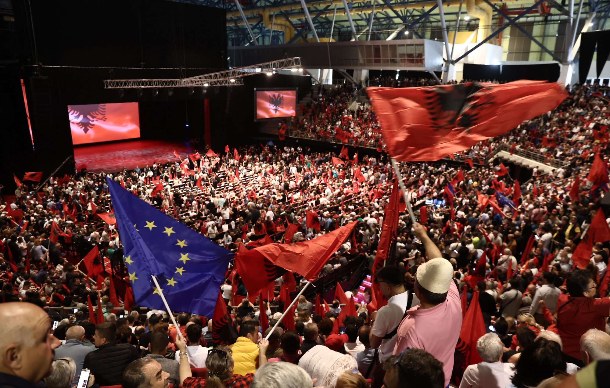 Ο Έντι Ράμα μπήκε στην αίθουσα λίγο μετά τις 12 υπό τους ήχους του αλβανικού εθνικού ύμνου και καταχειροκροτούμενος από τον κόσμο που φώναζε «Έντι, Έντι».