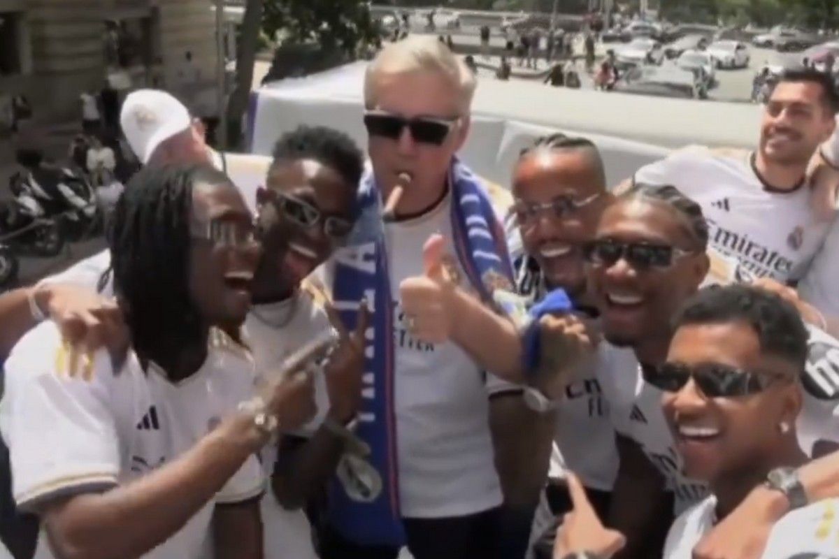 Οι μερένγκες έκαναν παρέλαση με το πούλμαν στους δρόμους της Μαδρίτης όπως συνηθίζουν και ο Κάρλο Αντσελότι, όπως και πριν από δύο χρόνια, κάπνισε το πούρο του και πόζαρε στην κάμερα.