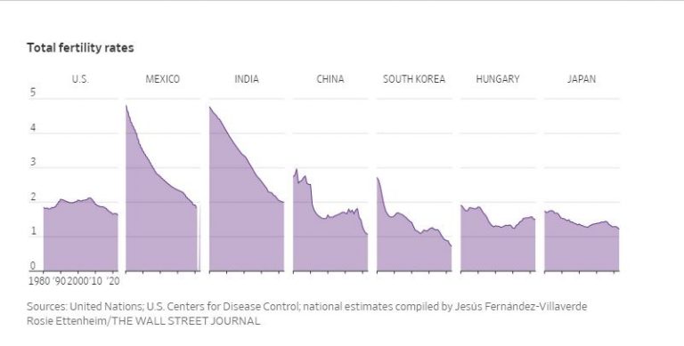 Στα έθνη με υψηλό εισόδημα η γονιμότητα έπεσε κάτω από το επίπεδο αναπλήρωσης του πληθυσμού στη δεκαετία του 1970, ενώ πτωτική τάση παρουσιάζει και στις αναπτυσσόμενες χώρες. Η Ινδία ξεπέρασε την Κίνα ως η πιο πυκνοκατοικημένη χώρα πέρυσι, ωστόσο η γονιμότητά της είναι επίσης κάτω από το επίπεδο. «Ο δημογραφικός χειμώνας πλησιάζει», είπε ο Χεσούς Φερνάντεζ-Βιλαβέρντε, οικονομολόγος που ειδικεύεται στα δημογραφικά στο Πανεπιστήμιο της Πενσυλβάνια.