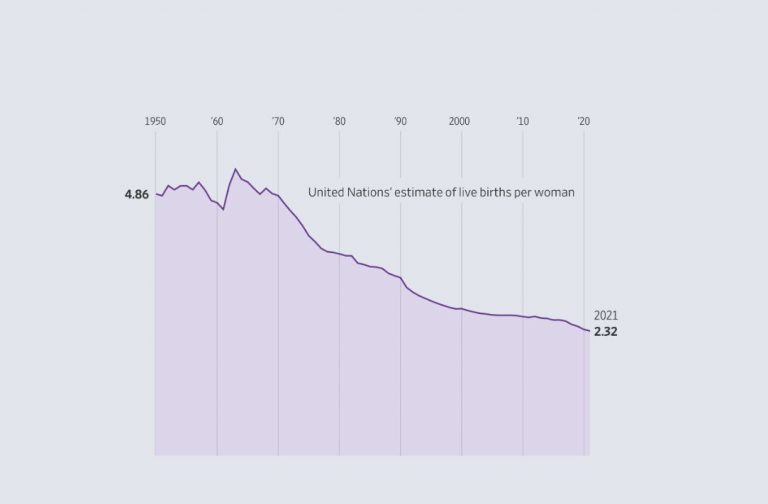 Το 2017 το παγκόσμιο ποσοστό γονιμότητας -πόσα μωρά αναμένεται να αποκτήσει μια γυναίκα κατά τη διάρκεια της ζωής της- ήταν 2,5. Τα Ηνωμένα Έθνη πίστευαν ότι θα πέσει στο 2,4 στο τέλος της δεκαετίας του 2020. Ωστόσο, μέχρι το 2021, ο ΟΗΕ συμπέρανε πως είχε ήδη μειωθεί στο 2,3.