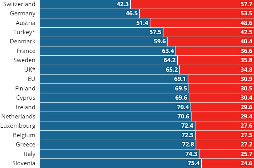 Η Ελβετία και η Γερμανία έχουν υψηλά ποσοστά ενοικίασης με πάνω από το ήμισυ του πληθυσμού τους να νοικιάζει σπίτια.