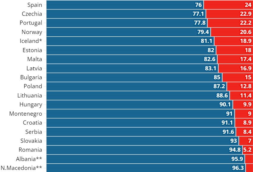 Η Βόρεια Μακεδονία, η Αλβανία και η Ρουμανία διαθέτουν ποσοστά ιδιοκατοίκησης άνω του 95%. Με εξαίρεση την Τουρκία, το ποσοστό ιδιοκατοίκησης ήταν υψηλότερο στις βαλκανικές χώρες, μια τάση που επεκτείνεται στην Ουγγαρία, τη Σερβία, την Κροατία και το Μαυροβούνιο.
