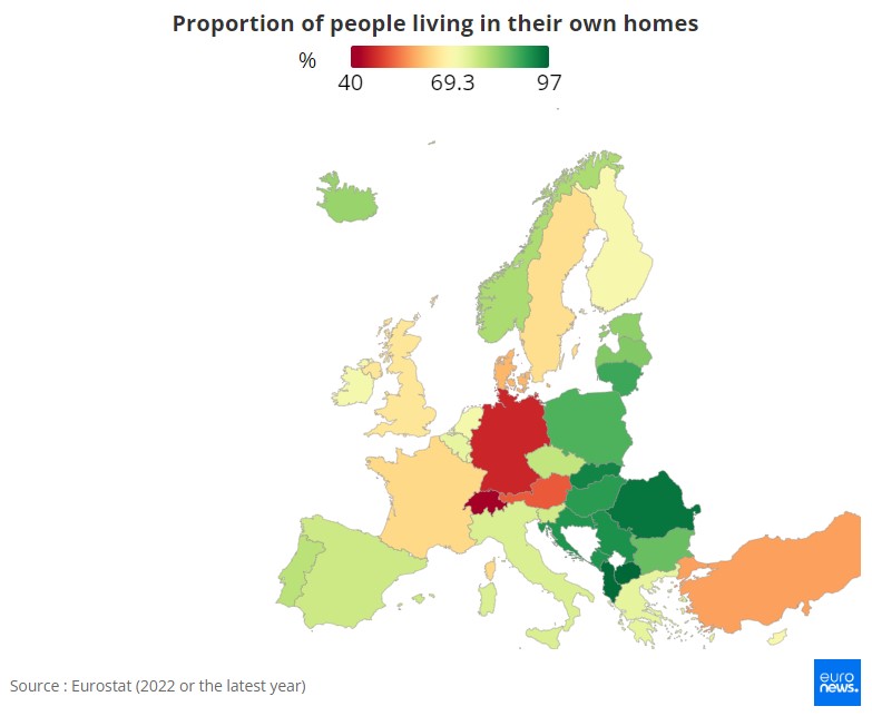 Στην Ευρώπη, το στεγαστικό τοπίο ποικίλλει, με σημαντικό χάσμα μεταξύ ιδιοκτητών κατοικιών και ενοικιαστών. Σύμφωνα με την Eurostat, σε οκτώ από τις 36 ευρωπαϊκές χώρες, πάνω από το 90% του πληθυσμού ζούσε σε δικό του σπίτι το 2022.