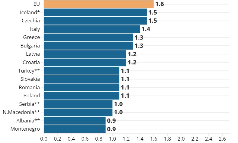 Τουλάχιστον ο μισός πληθυσμός στο Μαυροβούνιο, την Αλβανία και τη Σερβία ζούσε σε υπερπλήρη σπίτια. Το ποσοστό υπερπληθυσμού ήταν 16,8% στην ΕΕ.