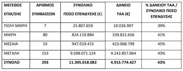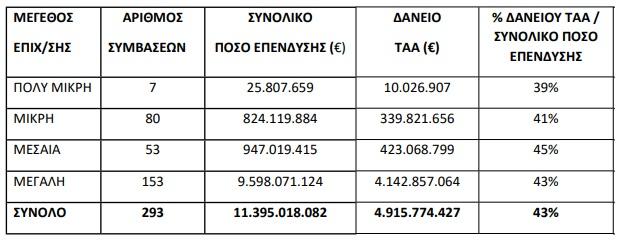 – Από τα 17,7 δισ. ευρώ έχουν συμβασιοποιηθεί 4,9 δισ. (27%). Το 15,7% αποδόθηκε στις πολύ μικρές, μικρές και μεσαίες επιχειρήσεις (οι τρεις κατηγορίες αποτελούν το 99,9% της επιχειρηματικότητας), το δε 84% στις μεγάλες (0,01% του συνόλου)».