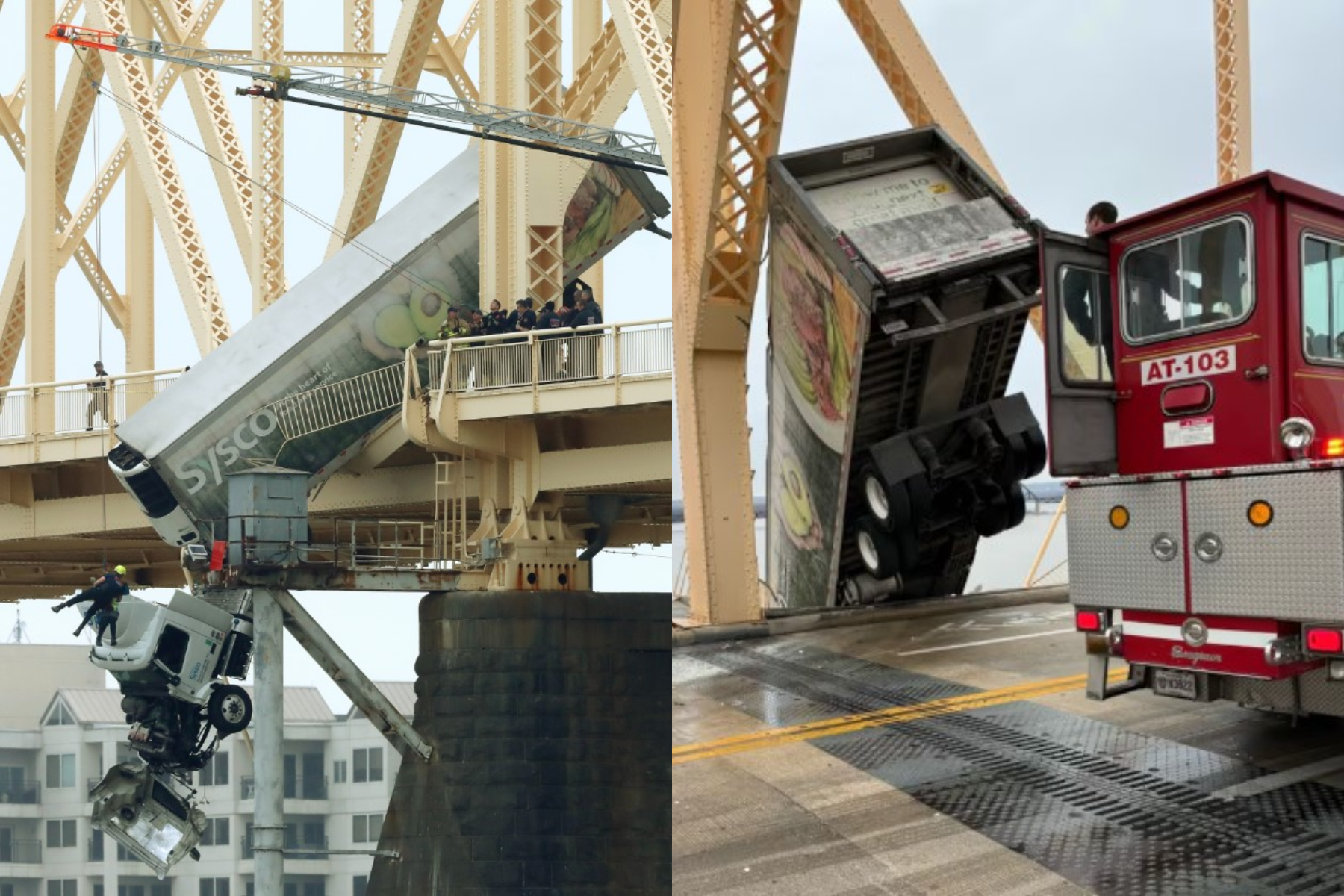 Σοκαριστικά πλάνα κατέγραψε κάμερα από το εσωτερικό νταλίκας λίγο πριν το τροχαίο στο οποίο ενεπλάκη και κατέληξε να κρέμεται από μια κλωστή στην πολυσύχναστη γέφυρα Clark Memorial Bridge στην πόλη Λούισβιλ της πολιτείας Κεντάκι των ΗΠΑ.