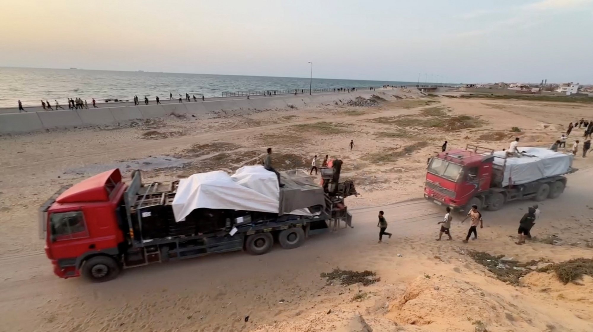 Φορτηγά μεταφέρουν βοήθεια που παραδίδεται στη Γάζα μέσω της πλωτής προβλήτας