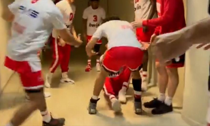 Αυτή τη φορά όμως το τελετουργικό των παικτών του Ολυμπιακού λίγο πριν βγουν στο παρκέ παραλίγο να έχει… θύμα.