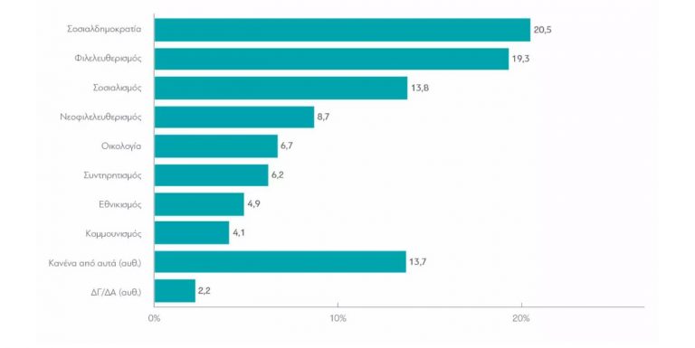 Από την άλλη πλευρά, ο φιλελευθερισμός βρίσκεται στα ίδια επίπεδα (19,3%) και μάλιστα, παραμένει σχεδόν απολύτως σταθερός διαχρονικά από το 2016. Τρίτος σε αναφορές εμφανίζεται ο σοσιαλισμός (13,8%), ο οποίος αν και καταγράφει φέτος το υψηλότερο ποσοστό από το 2016, παρουσιάζει κι αυτός μια σχετική σταθερότητα διαχρονικά.