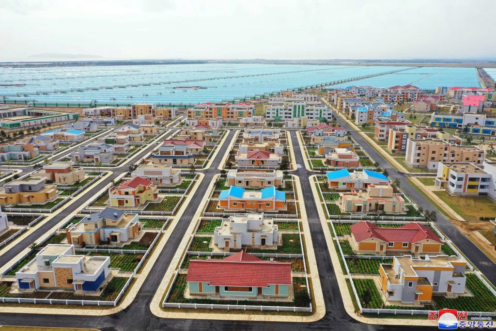 Τα θερμοκήπια της Φάρμας Ριόνφο διακρίνονται πίσω από έναν ολοκαίνουργιο οικισμό με μονοκατοικίες (KCNA via Reuters)