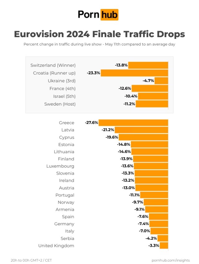 Η Ελβετία κατέκτησε στη φετινή Eurovision την πρώτη θέση, με το Nemo και το «The Code». Η χώρα σημείωσε πτώση στο Pornhub -13,8%, ενώ η Κροατία, που με τον Baby Lasagna και το «Rim Tim Tagi Dim» κέρδισε τη δεύτερη θέση κατέγραψε πτώση -23,3%.