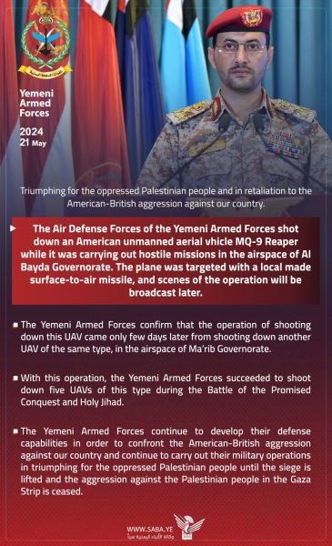Οι Χούθι της Υεμένης κατέρριψαν ένα αμερικανικό μη επανδρωμένο αεροσκάφος MQ-9 πάνω από την επαρχία αλ-Μπάιντα στη νότια Υεμένη, ανέφερε ο στρατιωτικός εκπρόσωπος της οργάνωσης Γιαχία Σαρί σε τηλεοπτική δήλωση.